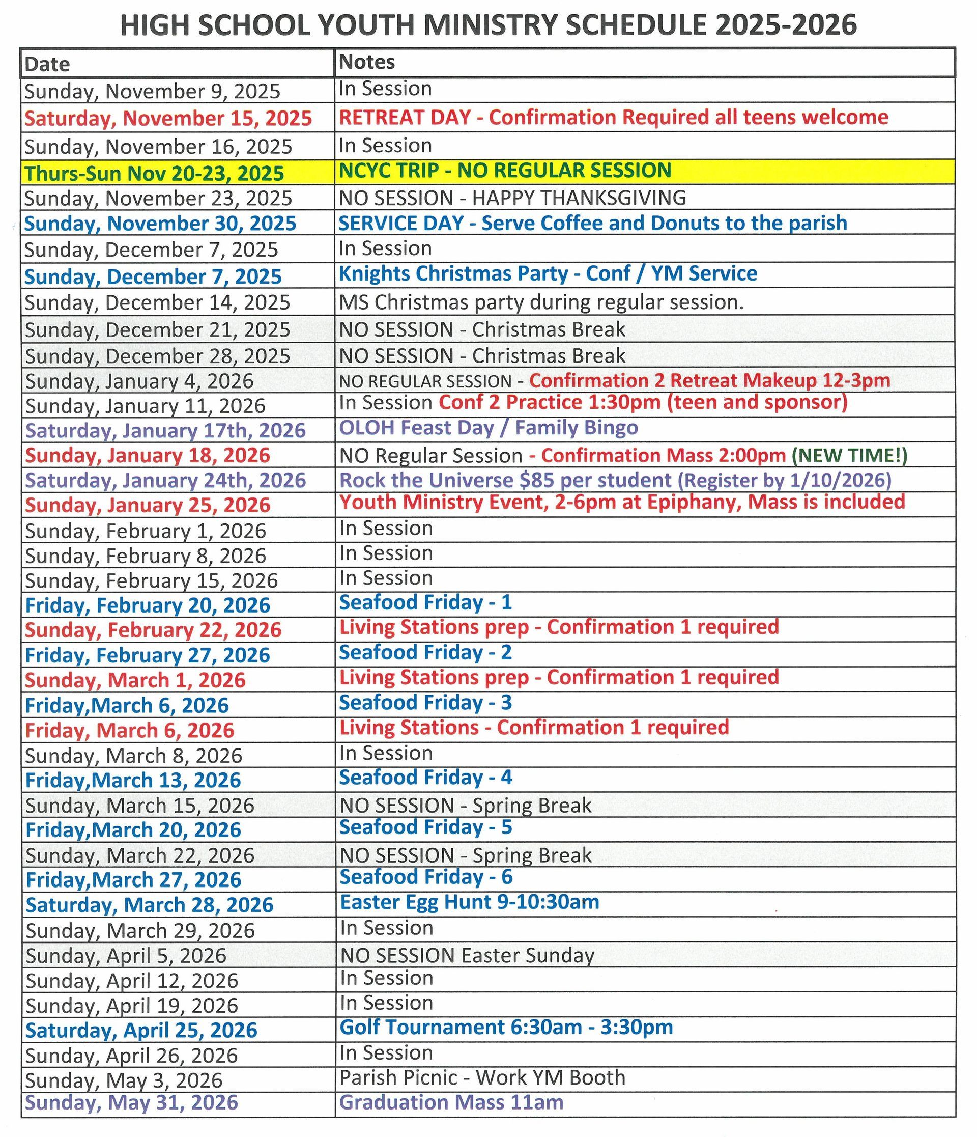 At the 2:00pm Mass (NEW TIME!). Students attend our weekly Youth Group sessions and participate in community activities and service projects. There will also be a make up retreat on January 4th, 2026 at 12-3pm.