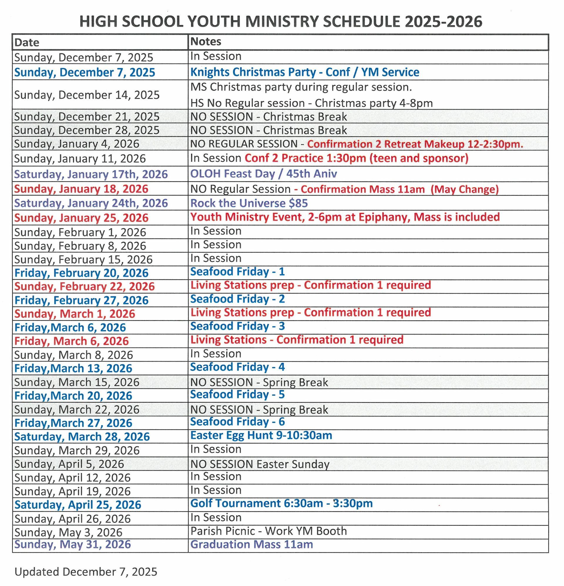 At the 11:00am Mass. Students attend our weekly Youth Group sessions and participate in community activities and service projects. There will also be a make up retreat on January 4th, 2026 at 12pm.